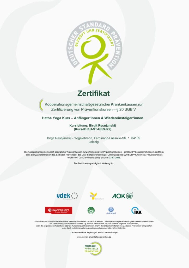 Da meine Kurse von den meisten gesetzlichen Krankenkassen anerkannt sind (Zertifizierung durch die Zentrale Prüfstelle Prävention), besteht in der Regel die Möglichkeit einer anteiligen Erstattung der Kursgebühr durch die Krankenkasse. Bitte fragen Sie bei Ihrer Krankenkasse nach den konkreten Bedingungen. Seit 2009 bin ich offizielle AOK-PLUS-Partnerin. Teilnehmer*innen können für die 10-er Kurse, je 90 Minuten von der AOK PLUS einen Gutschein bekommen.